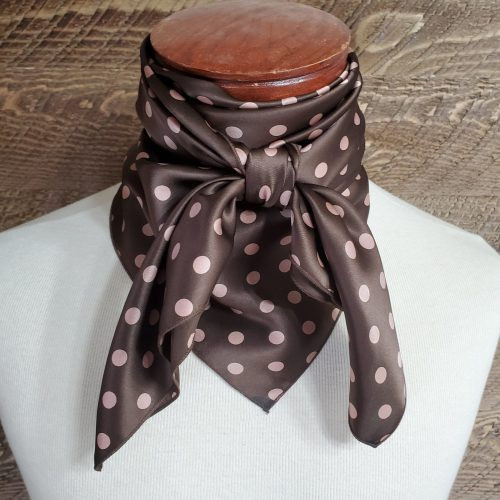 This 100% silk Charmeuse dot print is one of our heavier silk fabrics. The classic polka dot pattern is a favorite that will never go out of style. It has a shiny finish on the front side and a dull finish on the backside. The tan dots are 3/8″ and are arranged in set layout pattern and can be worn with a wide selection of patterns. Do be afraid of wearing our polka dots with stripes, plaids or florals – afterall, they are not called wild rags for nothing.